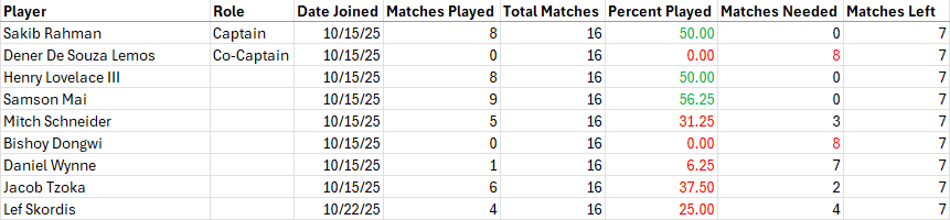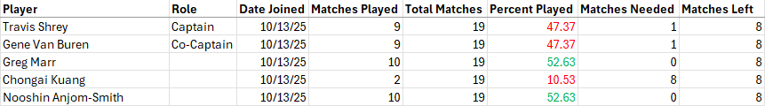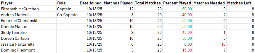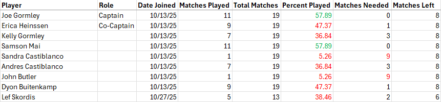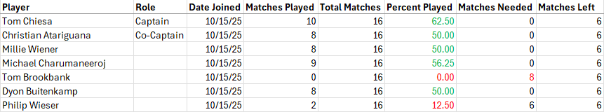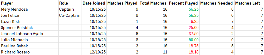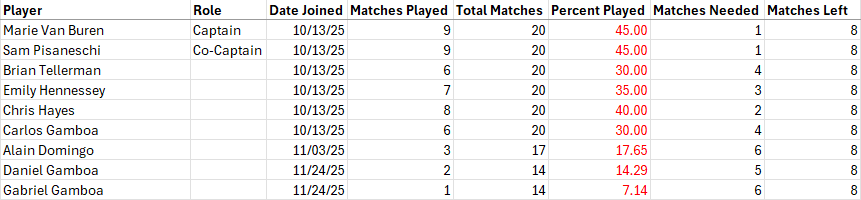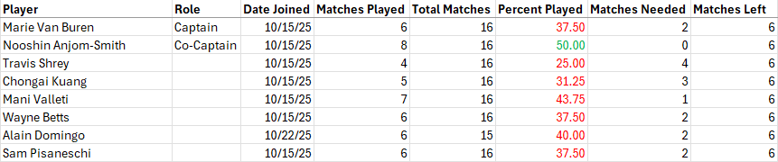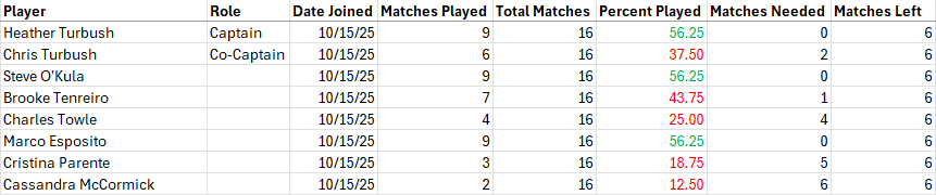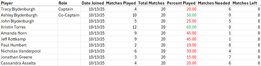 Rosters As of 01/23/2026 Open League A Notorious DIG Five Old People Set to Fail Safe Serve-ivors Open League B Half-n-Half The VolleyBeez Les Indésirables Net Gains Block Party Open League C 6.net Volley Brawlers Beta Blockers Hard Hitters